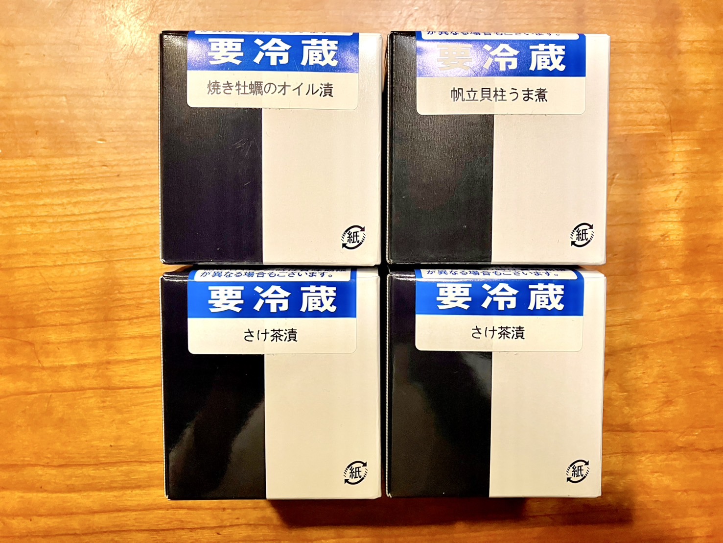 「さけ茶漬」が2瓶、「貝柱のうま煮」が1瓶、「焼き牡蠣のオイル漬」が1瓶出てきた! いちばん食べたかったさけ茶漬けがいっぱい入っていて嬉しい。
