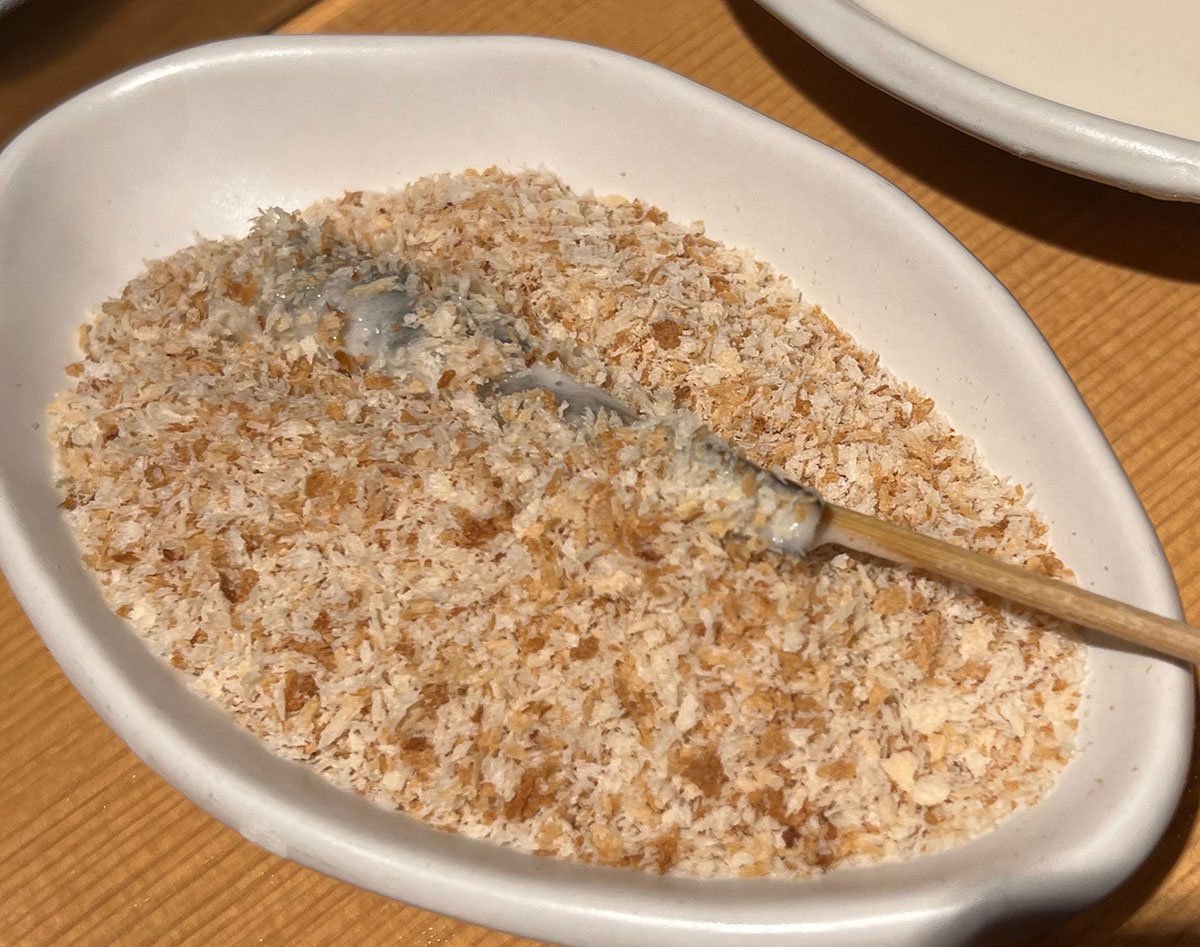 先ほど店員さんが手に持った粉とタレは、小麦粉を溶いた「ねり粉」と「パン粉」。