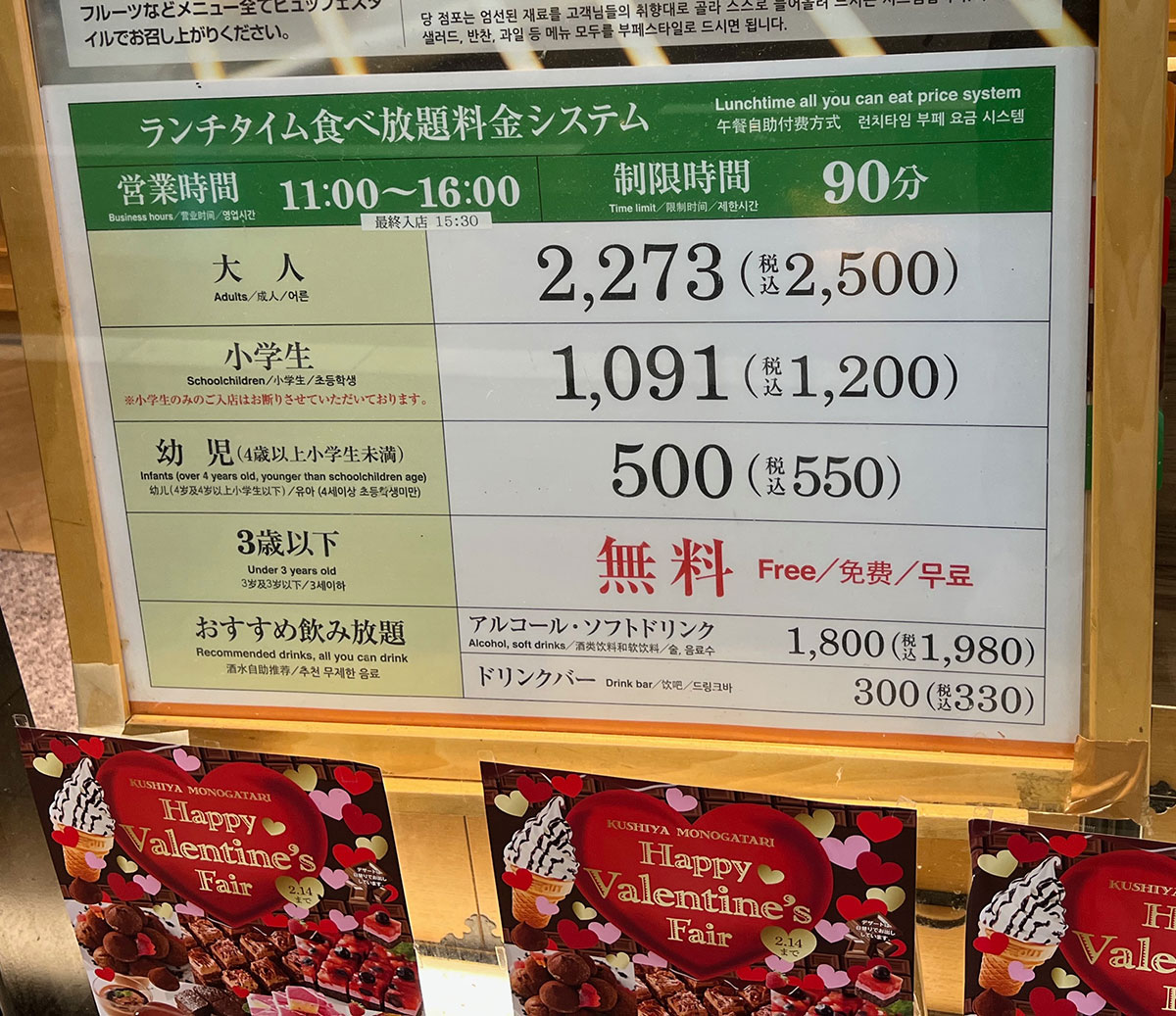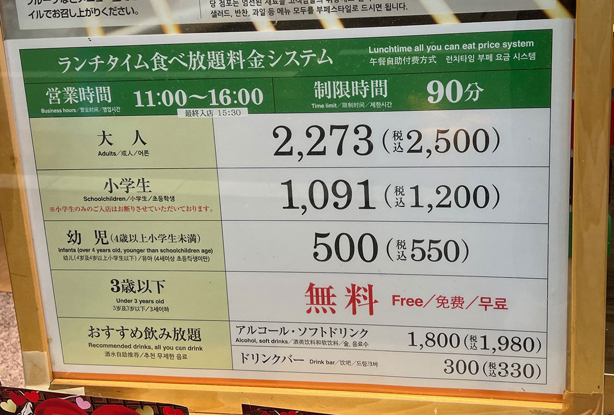 ▼こちらはランチビュッフェの価格。食べ放題の時間は90分だ