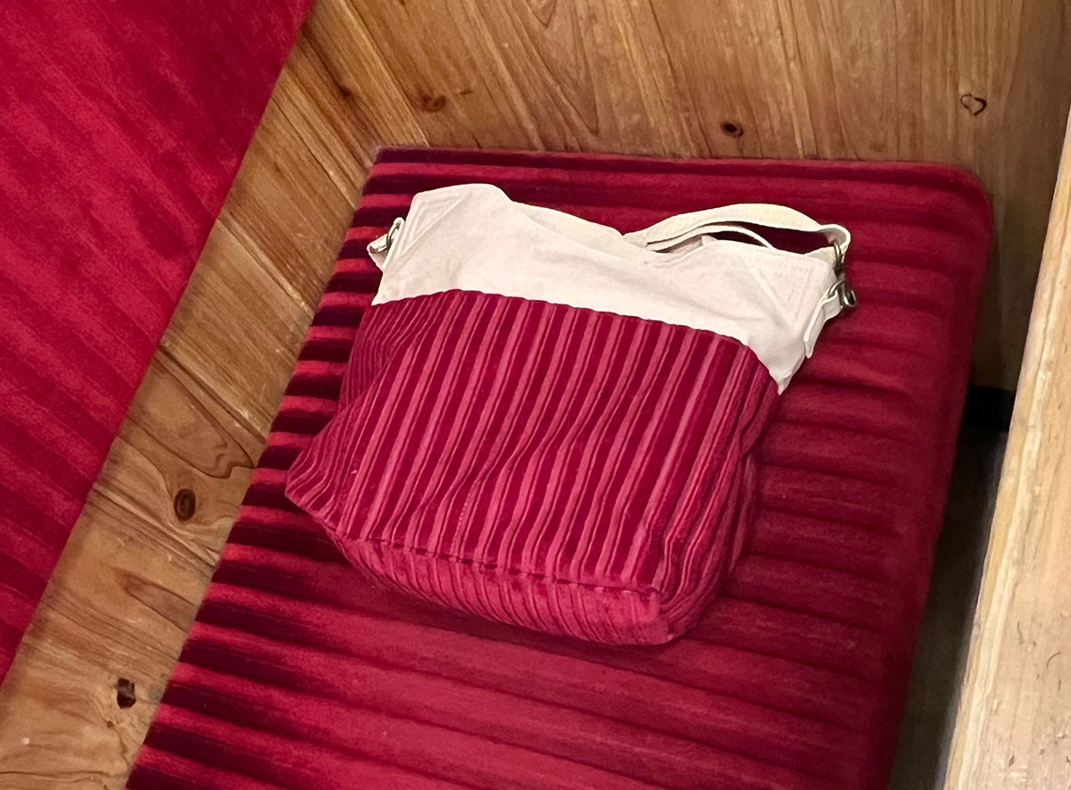 なお、このショルダーバッグを実際にコメダの椅子に置くと擬態みたいになる。