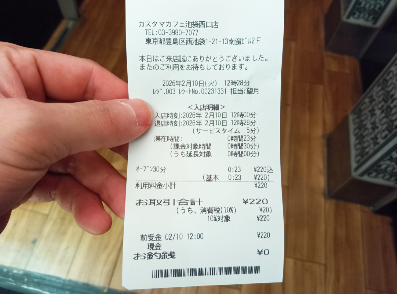 結果として、12時イン12時28分アウトで利用料金は合計220円。ガチで総額220円だけで済んでしまった。レシートをもらっても信じられない。嘘だろ? 凄すぎないか?