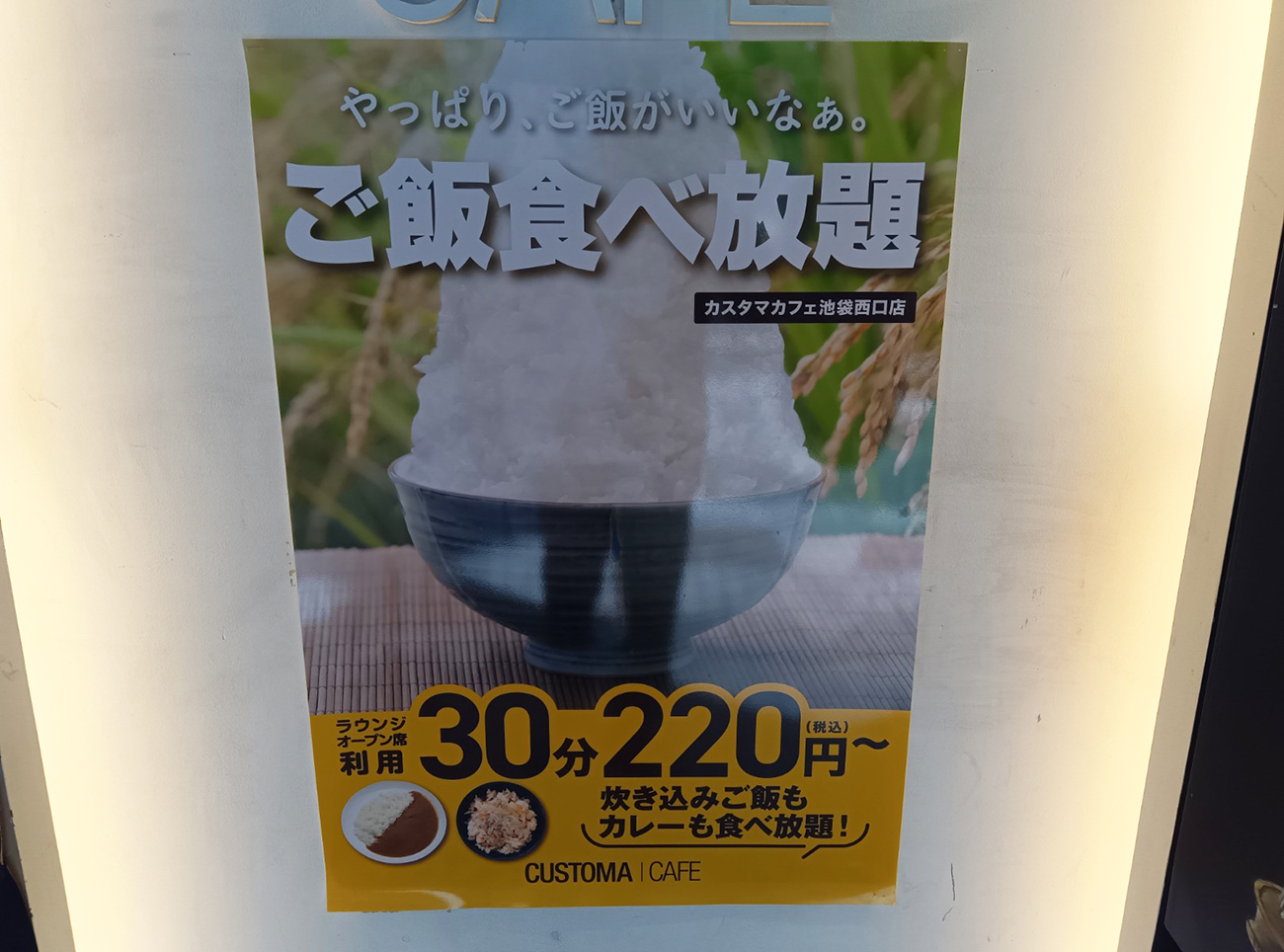 それが池袋西一番街ロマンス通りの入口にある『カスタマカフェ』だ。ここ、カレー食べ放題の看板が出てるんだけど、よく見たら理論上カレー食べ放題が220円で利用できてしまうのである。そんなバカな……! 安すぎて不安。本当に220円で済むのか? そこで入店してみることにした。
