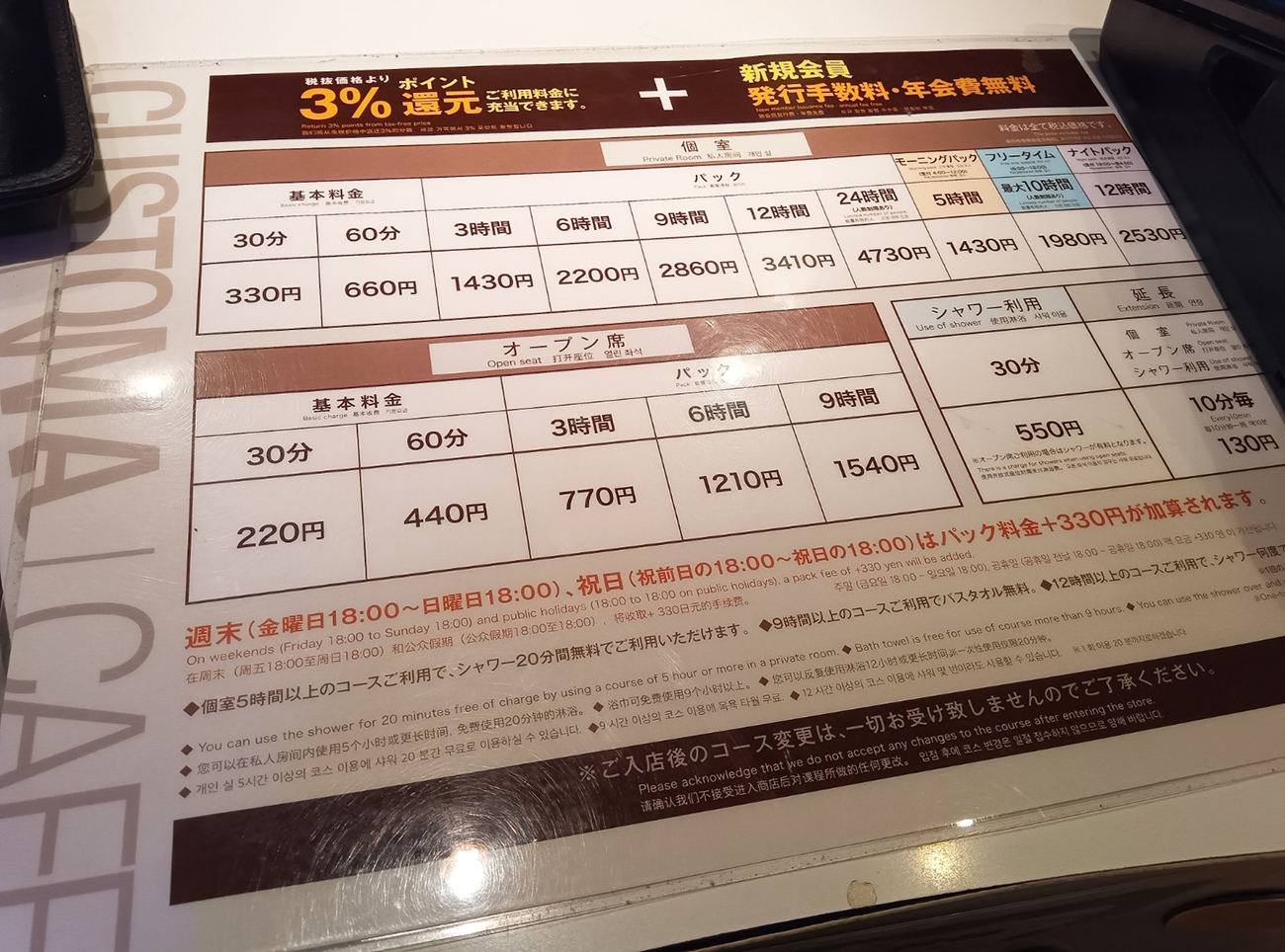 1つ注意点があるとすれば、延長料金がちょっと高めなことだろうか。10分延長で130円だから、もうちょっとゆったりしたい人は最初から60分コースを選ぶなどの選択をした方が良いだろう。60分でもオープン席440円だし、オープン席には電源もついてるし、もちろんマンガもある。