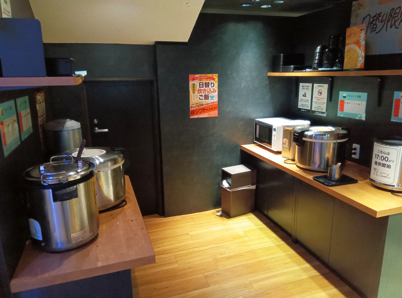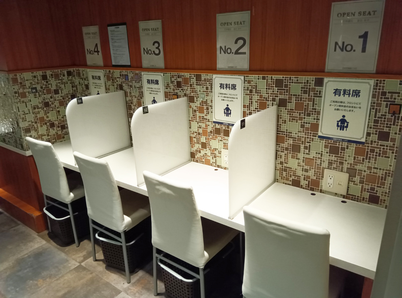 念のため店員さんに確認したけど、やはりオープン席も食べ放題利用可能とのこと。オープン席に行ってみると、1人分のスペース最小限のチェーン飲食店スタイル。くつろぐことはできないけど、逆に言うと食べるだけならこれで十分とも言える。