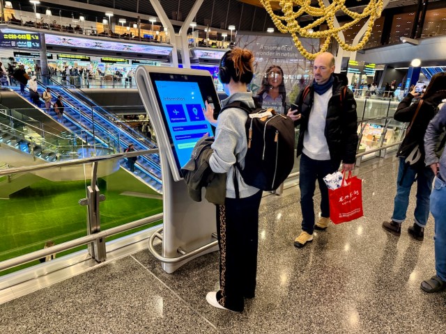 となると、巨大ハブ空港ではよくある話だが、電光掲示板を気にしながら時間をつぶすことになる。そんなわけで空港内をうろついていたら妙な光景を目にした。イオンモールにありそうな大型タッチパネル端末に、皆が搭乗券をかざしているのだ。