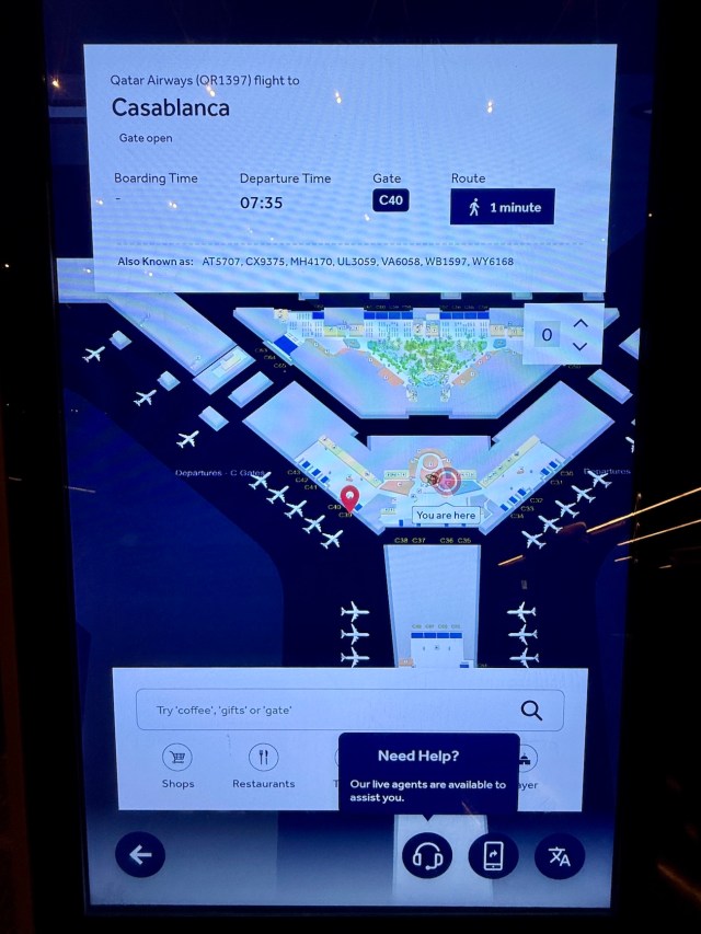 日本で同じように搭乗ゲートで悩むことがないので確認したわけではないが、フロアマップ端末はあっても「自分のフライト専用ルート」を一発表示してくれる端末はまだ一般的ではない印象。