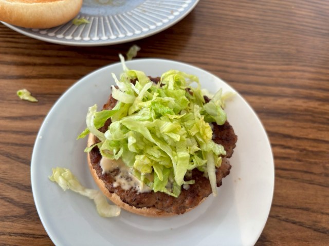 バンズ、ソース、パティ、ソース、レタス、ソース、バンズの順に乗せていく。