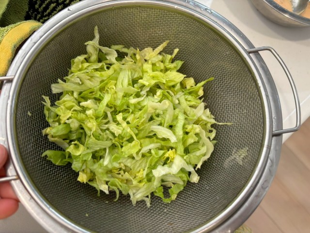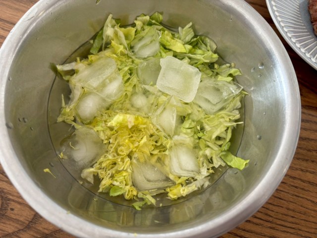 レタスはできるだけ細かい千切りにして、氷水に5分ほどつけておく。