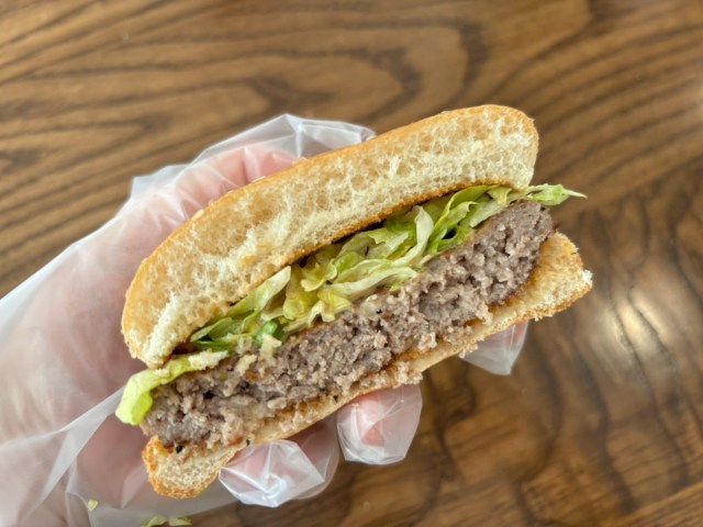 ジュージュー焼いたポークパティは表面が香ばしく、中はしっかり肉の旨み。多めに入れたレタスのシャキシャキ感が思った以上に効いていて、重さを感じさせない。