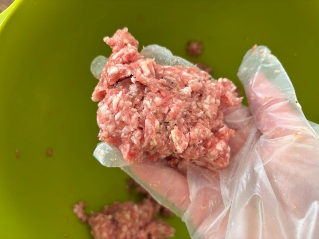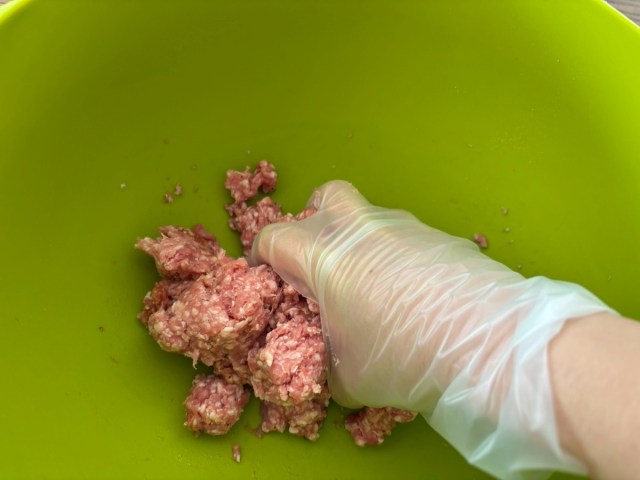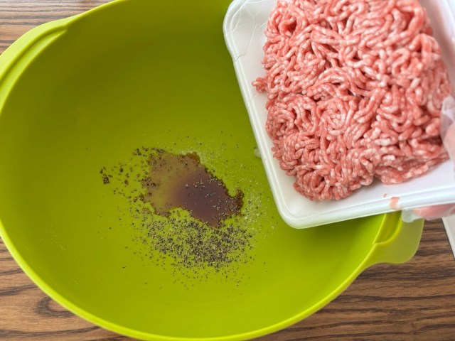 最初は、パティ用の調味料と豚ひき肉を混ぜていく。