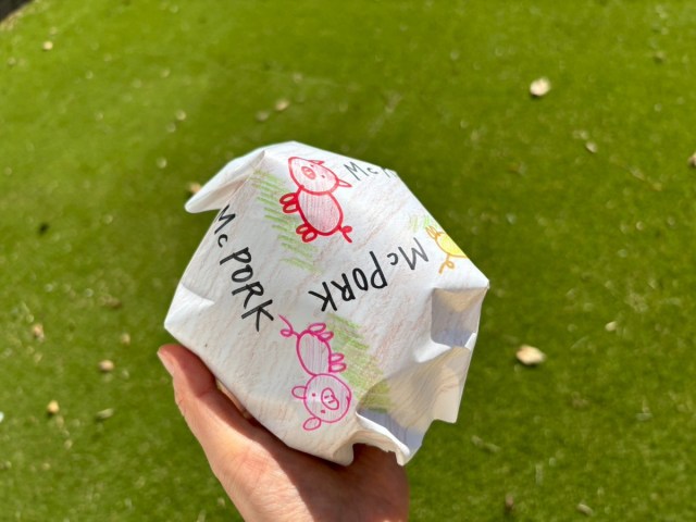 まぁ、でもマックポーク風なので細かいことには目をつぶっていただけるとありがたい。せっかくなので、包み紙も作ってみようかなとトライしたけど、まぁこれは……ね。