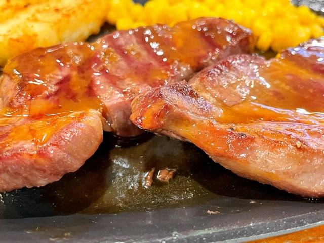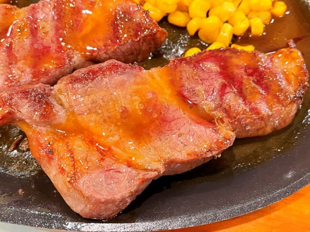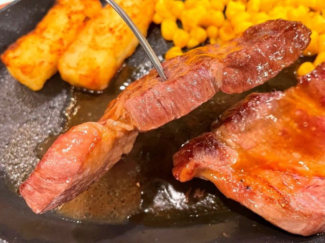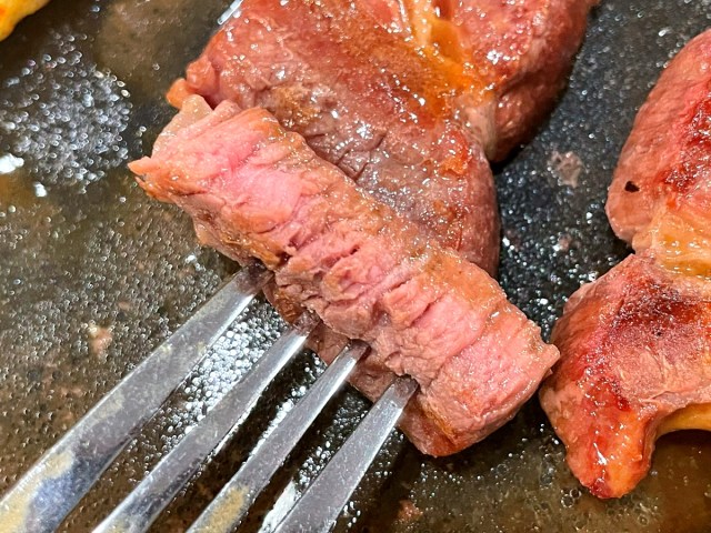 ステーキというよりは、ちょっと厚めの焼肉である。定期的に自宅でステーキを焼く私は経験上、これはただ硬いだけで味気ないガッカリ肉では? と懸念したのだが……。