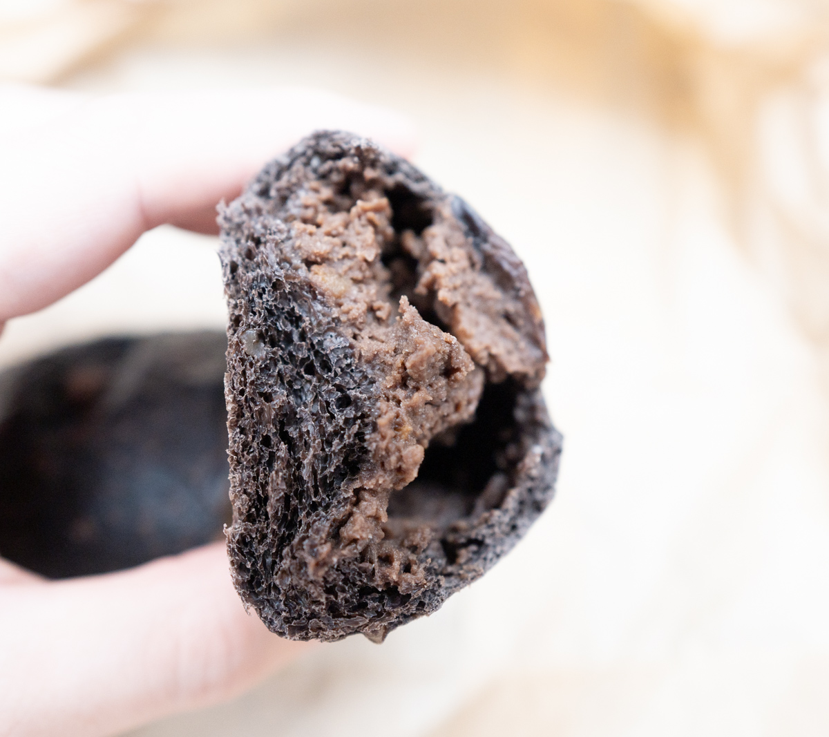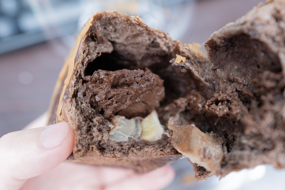 パン生地は硬く、噛むと、ココアだけでなく、仕込まれているクルミのフレーバーが染み出てくる。そして内部に大量に詰め込まれたチョコクリーム。