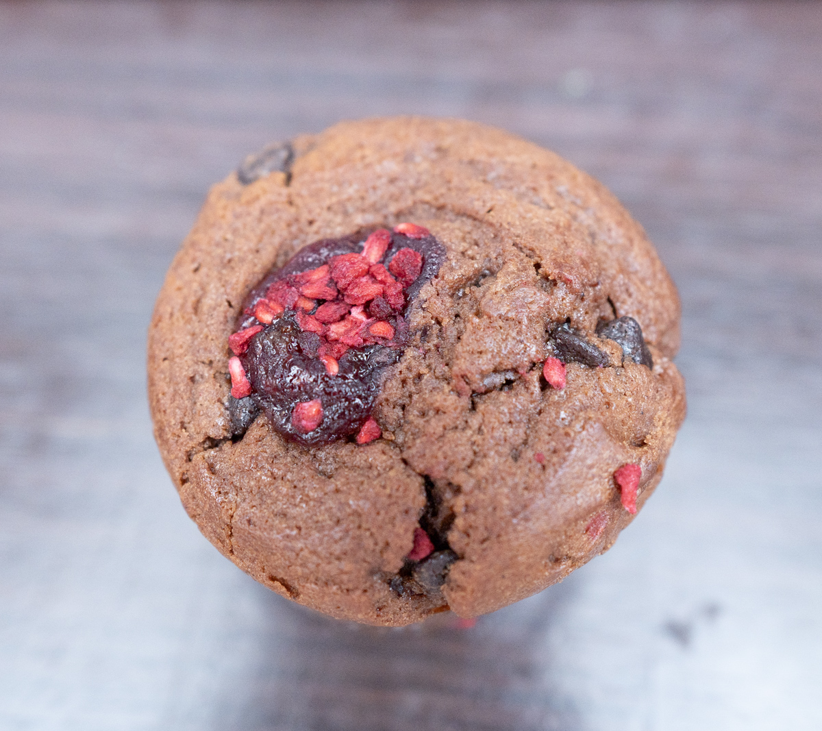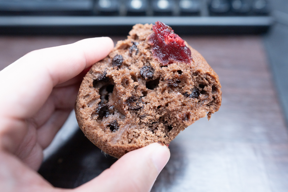 表面のトッピングはフリーズドライのフランボワーズとラズベリージャムだ。そして内部にチョコチップが入っている。
