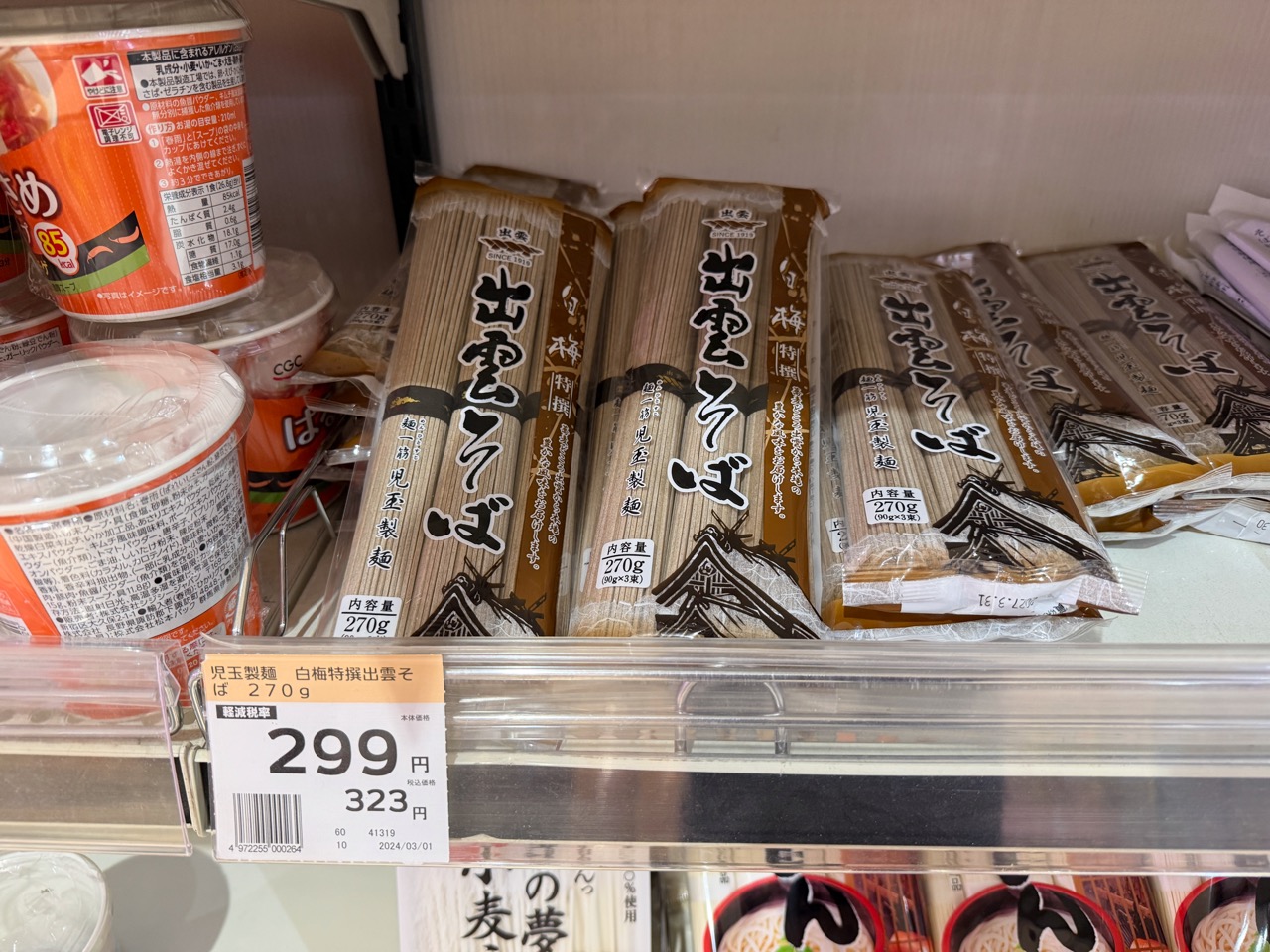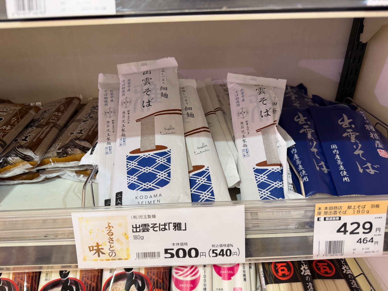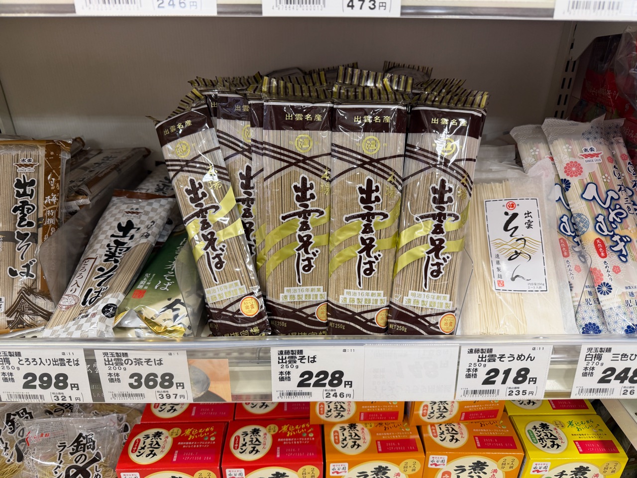 もちろん乾物コーナーの「干し蕎麦」である。やはり、“日本三大そば” のひとつに数えられている島根の「出雲そば」が数多く売られている。