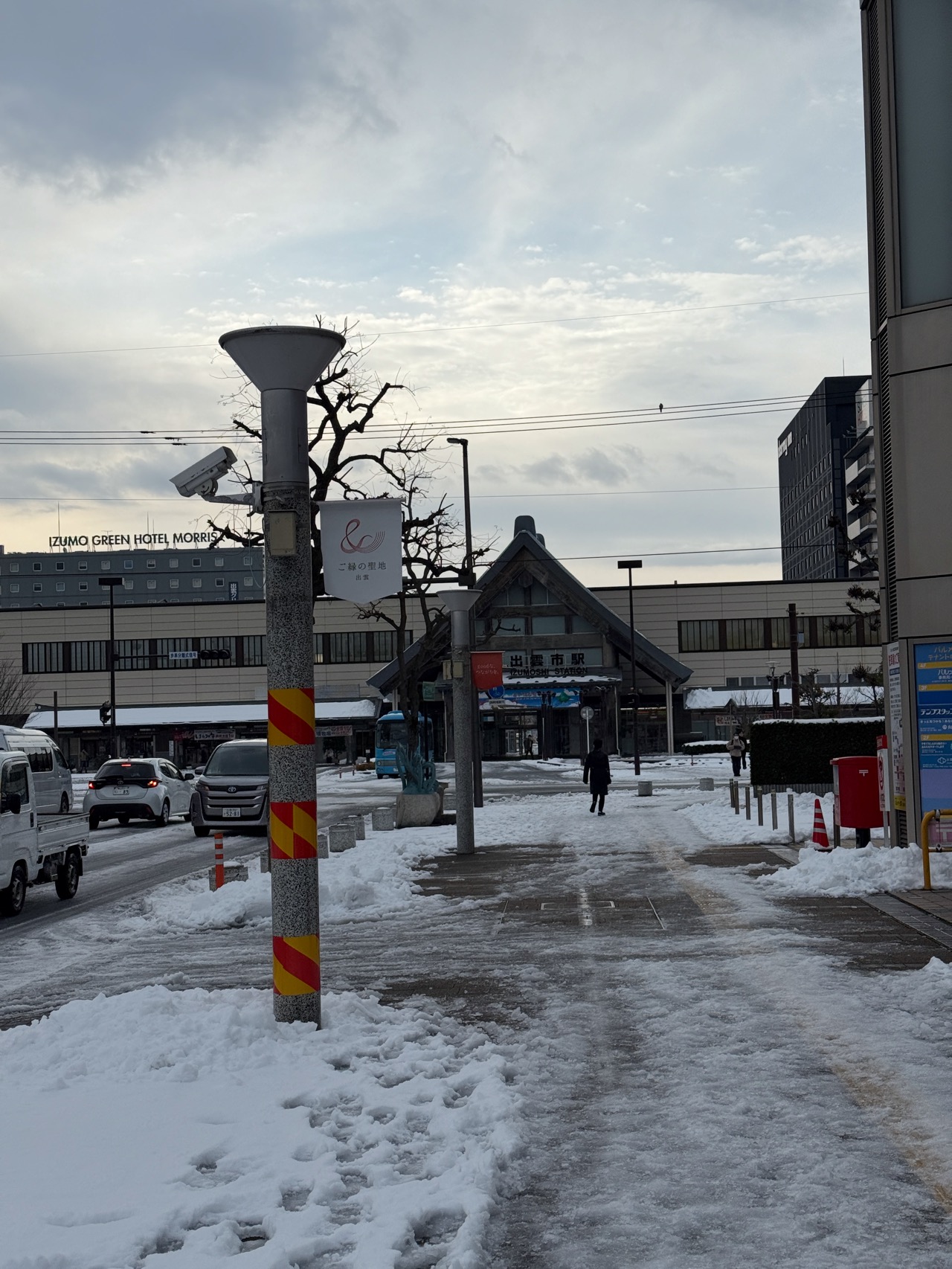 とりあえずの目的地「出雲市駅」も、けっこう深い雪が積もっており、ズボッ、ズボッと、真新しい雪に穴を開けながら歩を進めた。