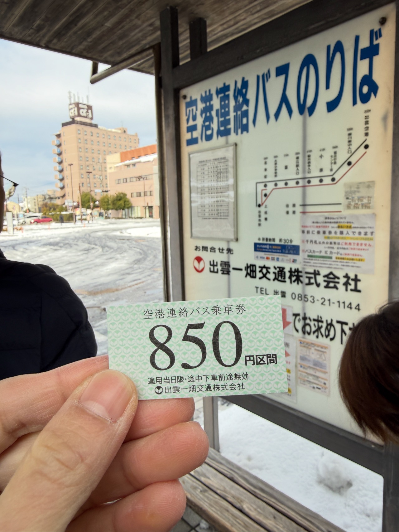 宿の店主に、「駅前の『ツインリーブスホテル出雲』のフロントで、空港までのバスチケットが買える」と教わっていたので、その通りに入手して、