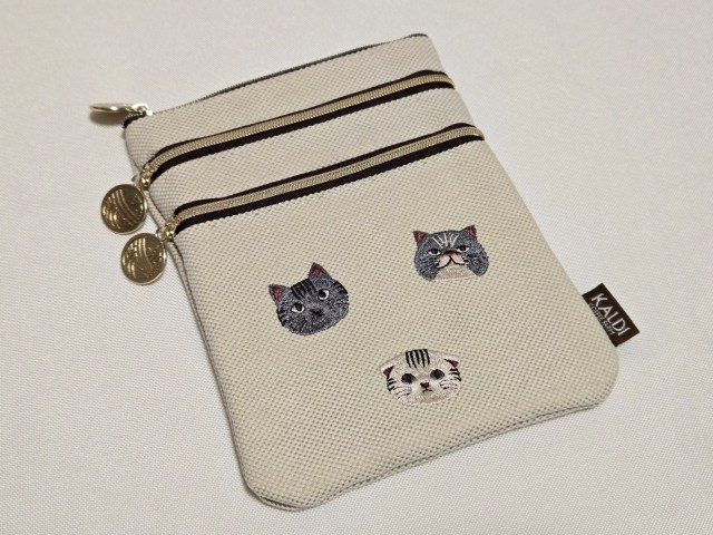 大きさが異なる3つのポケットにそれぞれファスナーが付いていて、ネコの刺繍がついている。ファスナーチャームが毛糸なのもかわいいな。