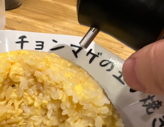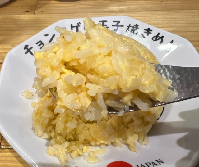 見た目は本当にシンプル。黄金色に輝くドーム状の焼きめしが、「チョンマゲの玉子焼きめし」と書かれた専用のお皿に盛られている。