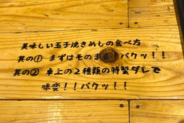 さらにカウンターの木製テーブルには、「美味しい玉子焼きめしの食べ方」が、刻印されている。こういった演出も粋だ。