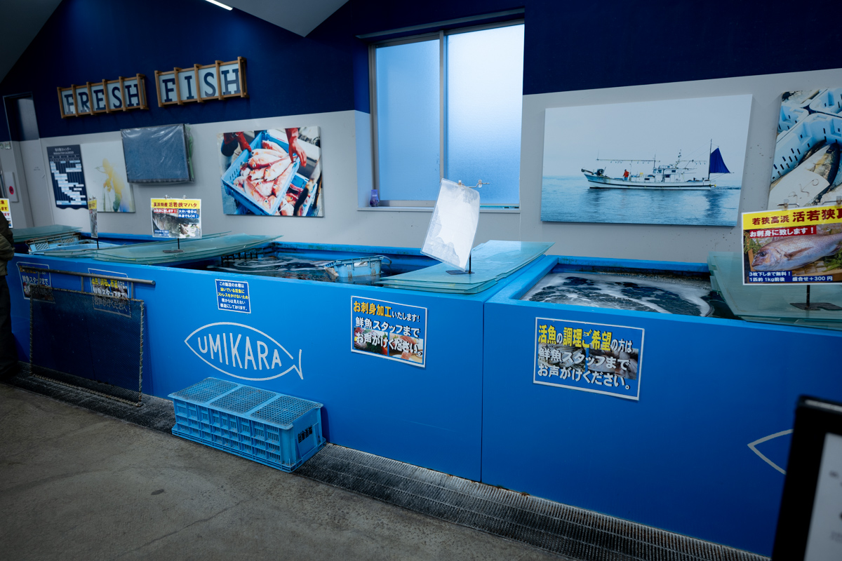 「UMIKARA」は高浜漁港の隣にあるのだが、水槽の魚はそこから来ているらしい。港町のローカルスーパーの強みだ。これらの魚は、そりゃあ美味いことだろう。