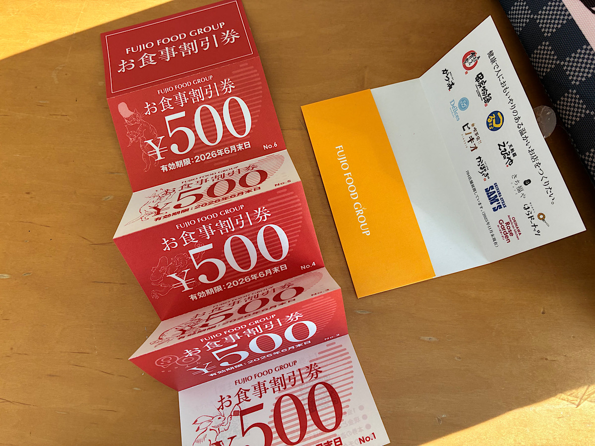まずはなんといってもコレ、お食事割引券。福袋の購入金額と同じ3000円分、500円×6枚。