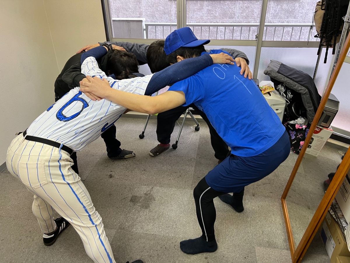 チームメイト(同僚)と円陣を組み……