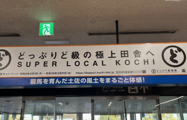 出口付近には「どっぷりど級の極上田舎へ SUPER LOCAL KOCHI」という自虐的(?)な看板も。