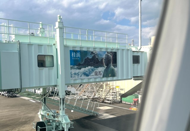 飛行機が空港に到着すると、ボーディングブリッジには早くも「桂浜」と「龍馬」の文字が。もう着陸した瞬間から龍馬推しが始まっている。