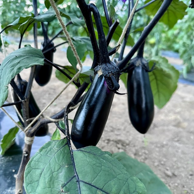 ナスも暑さに比較的強い。こまめに水やりをすれば安定して生育する。植え付け後に「支柱」を立てて枝を固定し、わき芽を摘んで風通しをよくしておけば基本はOK。