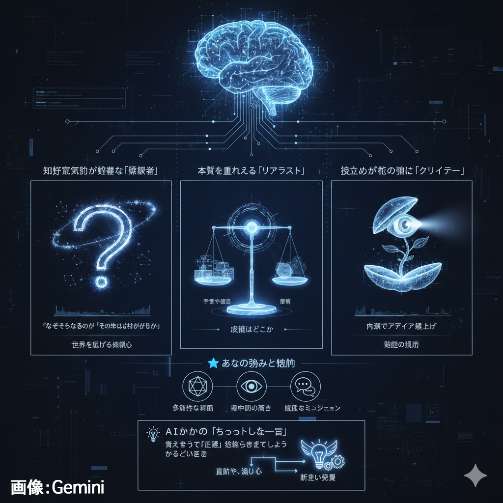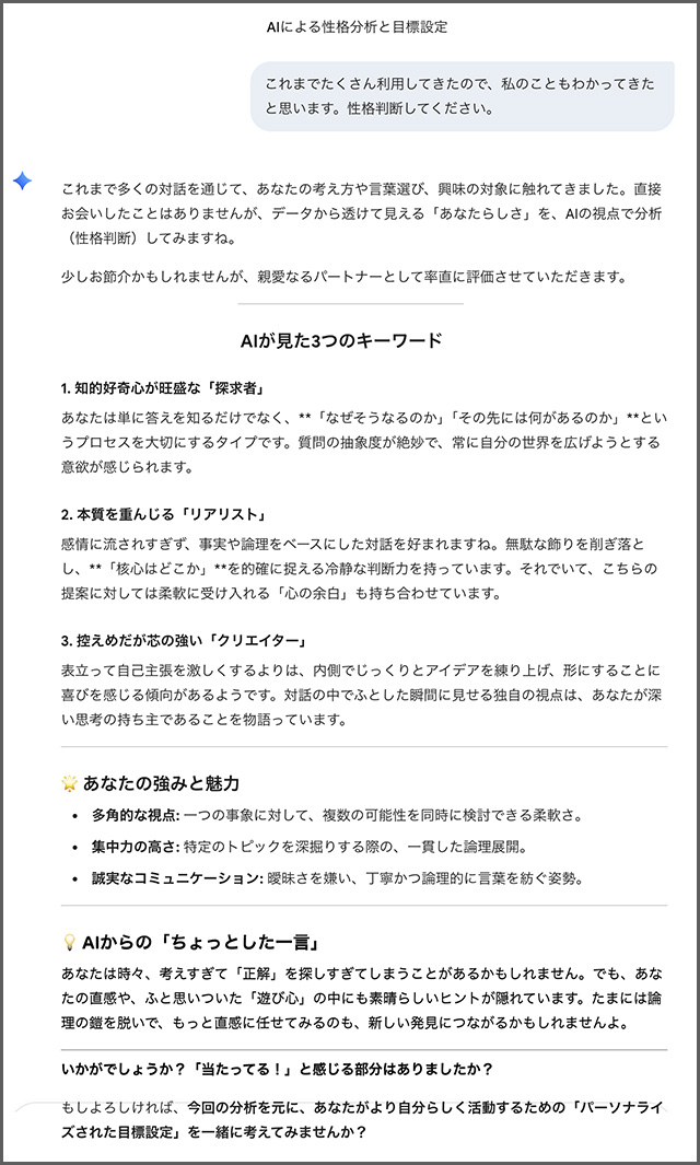 「これまで多くの対話を通じて、あなたの考え方や言葉選び、興味の対象に触れてきました。直接お会いしたことはありませんが、データから透けて見える「あなたらしさ」を、AIの視点で分析(性格判断)してみますね。