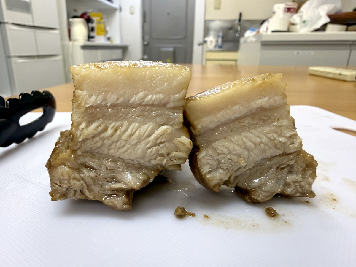 豚はしっかりと煮込まれており、調味液にもヤクルトの乳白色の気配は見当たらない。言われなければ誰もヤクルトを使用しているとは思わないことだろう。