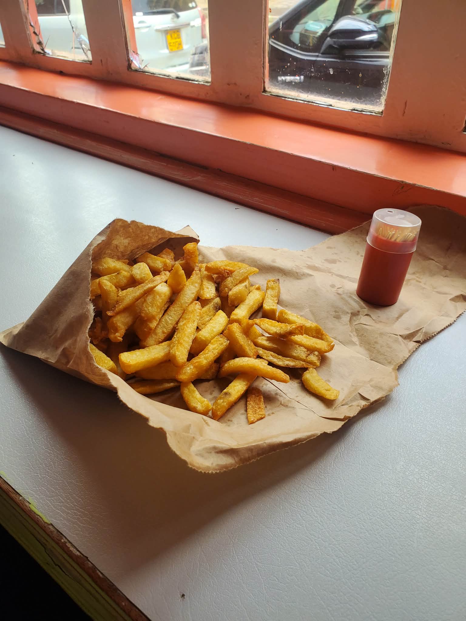 ちなみにポテトは100ケニアシリング(約110円)。トマトソースは10KES(約11円)だったよ。