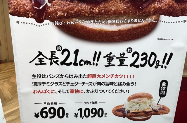 全長約21cm、重量約230gの超巨大なメンチカツをバンズで挟むという、もはやドムドム以外のバーガーチェーンでは企画が通らないだろう。常人の発想を超えたメニューではないだろうか。