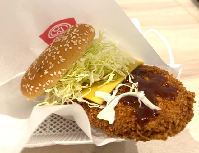 バンズの両サイドからメンチカツが大胆にハミ出している。これだけ具がハミ出ているのは、以前「イオンスタイル赤羽店」限定で販売された全長25cmの『赤い羽バーガー』以来の衝撃だ。まさに、通称 “ハミドム” の進化版と言えるだろう。