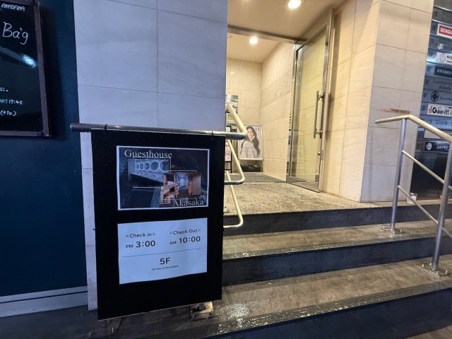 この日は仕事と用事を終えて21時過ぎに到着。飲食店がズラリと並ぶエリアの一角、雑居ビルの5階に「ゲストハウス アカサカ」があった。