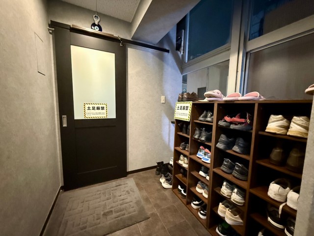 下駄箱にスニーカーやサンダルが並び、キャリーケースやバックパックが所狭しと置かれている。いかにも海外勢多めの安宿という空気感。