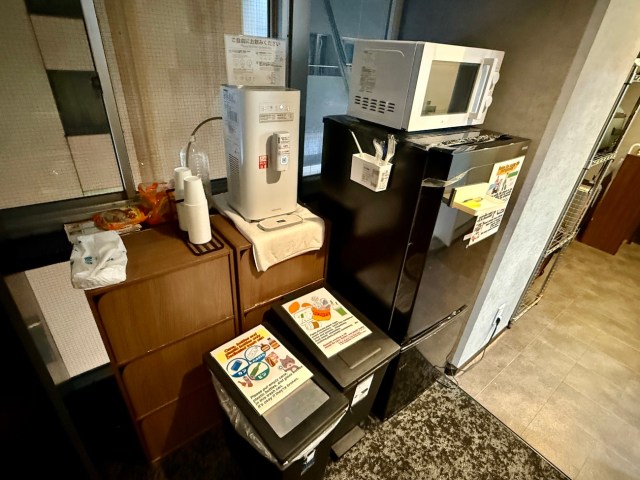 洗面所やシャワー、トイレは共用。ワークスペースや冷蔵庫、ウォーターサーバーもあり、最低限の設備はひと通り揃っていた。