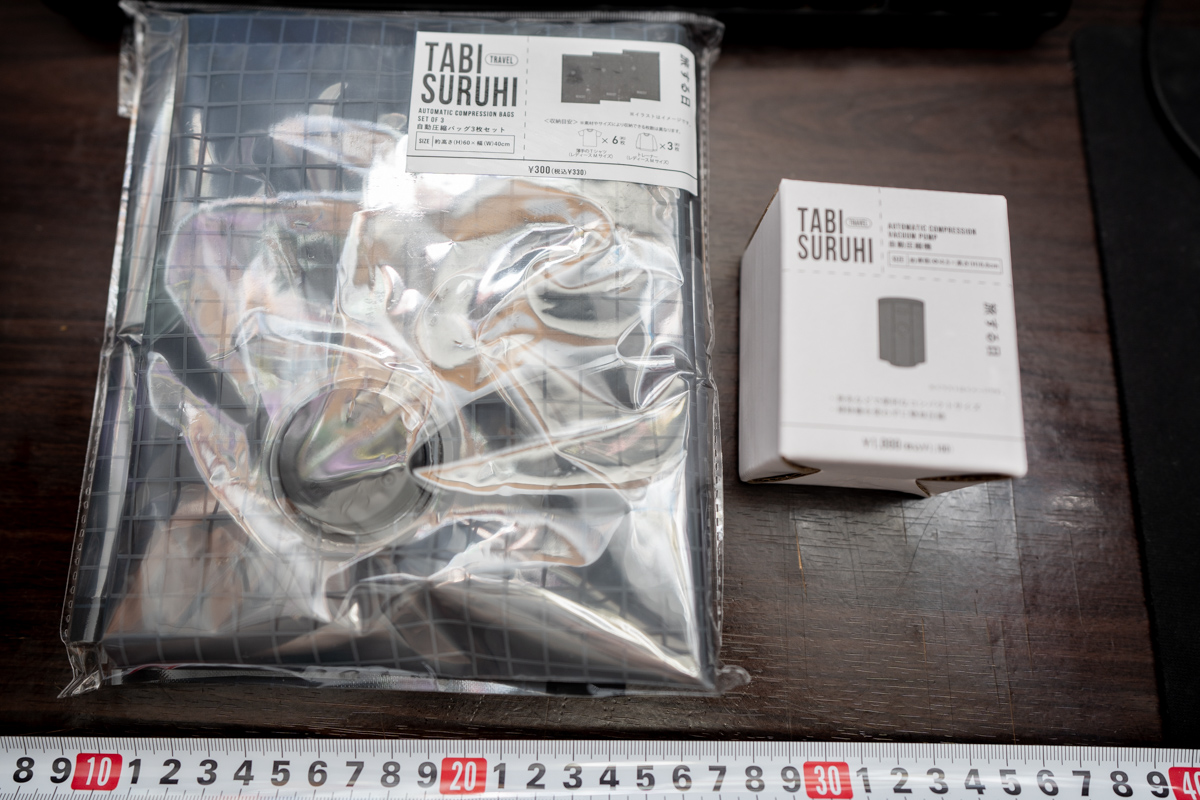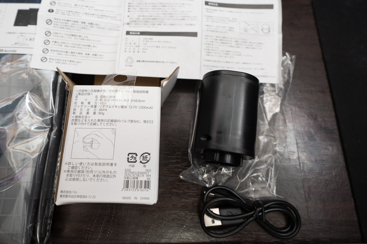 ということで、3COINS「自動圧縮機」と圧縮バッグ。本来は旅行時の衣類をコンパクトにすることを期待されたものですが、今回は重荷を承知で冬物衣類や布団を圧縮可能か試してみました。