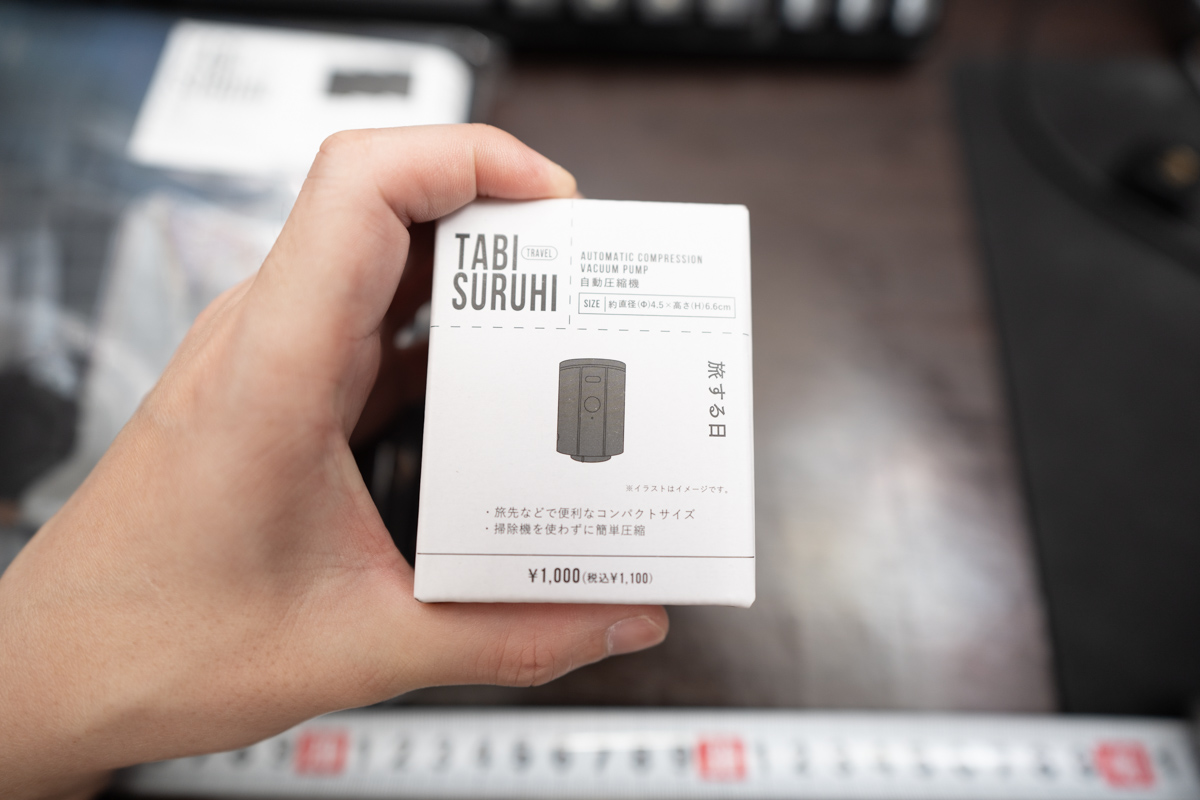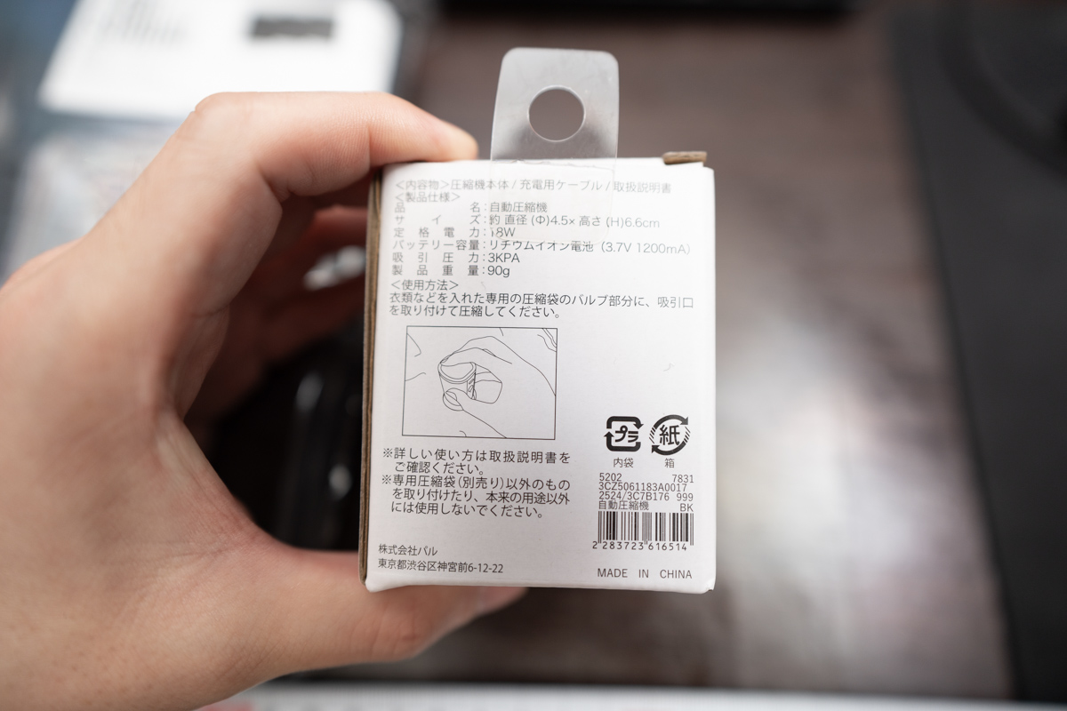 まずは商品の詳細を見ていきましょう。「自動圧縮機」は外箱の時点で片手に収まるサイズ。本体は90gで、多くのスマホよりも軽いです。