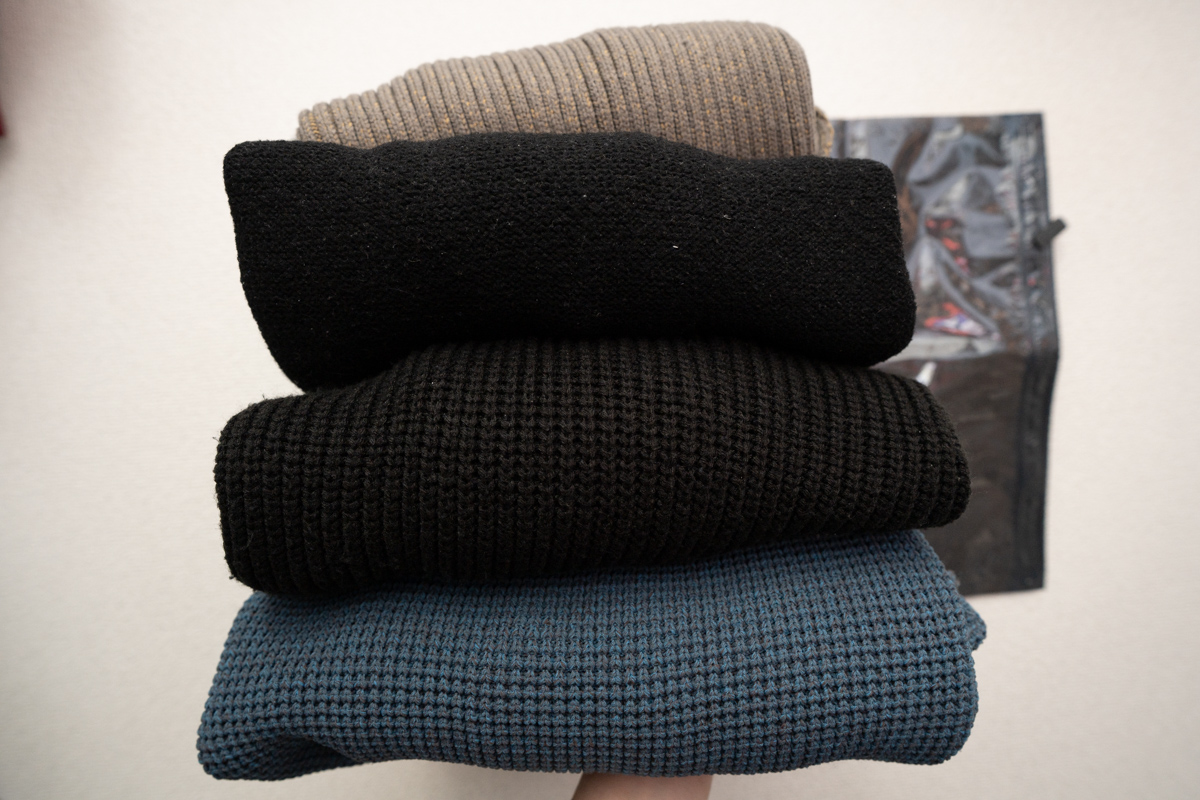 ここに長袖のニットの上着を4着用意しました。サイズ感は、ユニクロやGUの日本人男性向けMサイズのものと同じくらいです。