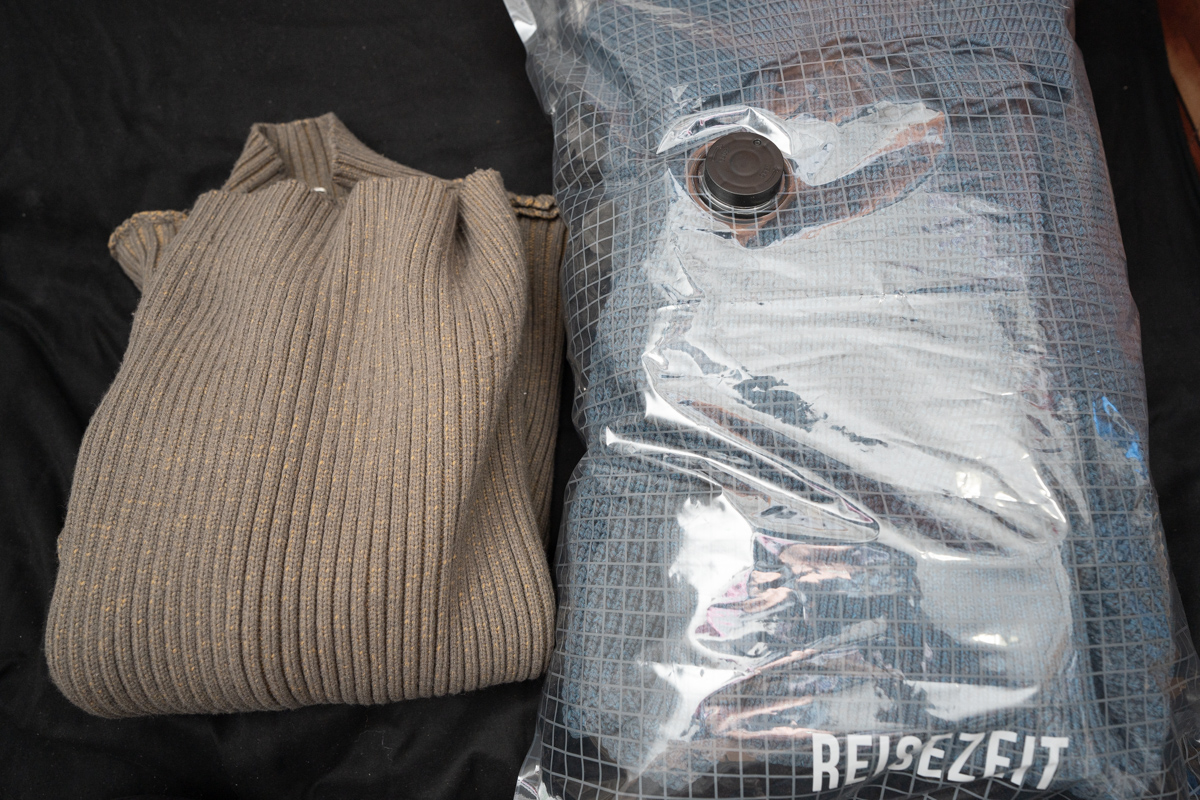 これを詰めた結果、3着が限界でした。袋を傷つけないよう、ボタンやファスナー部分は内側に畳み込んであります。これ以上はハンカチくらいしか入らないでしょう。