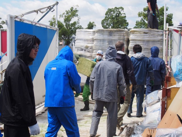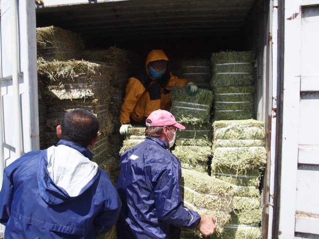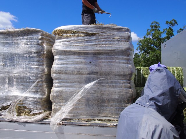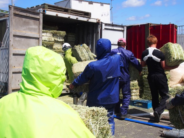 敷地ギリギリまでトラックに入ってもらい、そこから牧草を収納するコンテナまで25キロをひたすら運ぶ。中で整頓して積み上げる必要があるため、持ち上げて、向きを変えて、押し込んで、またトラックに戻る……それを延々とくり返すのだ。
