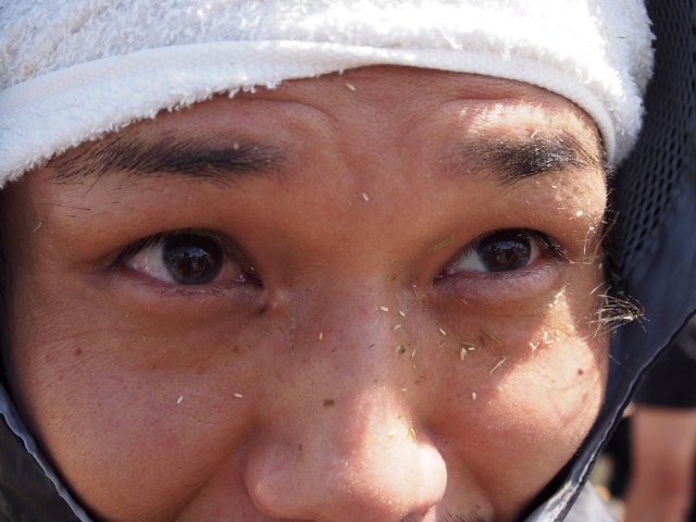 なぜ完全防備かというと、25キロの塊を持ち上げた瞬間、細かい草の繊維が舞い上がり、カッパの中に侵入してくるからだ。これがマジでずっとチクチクする。