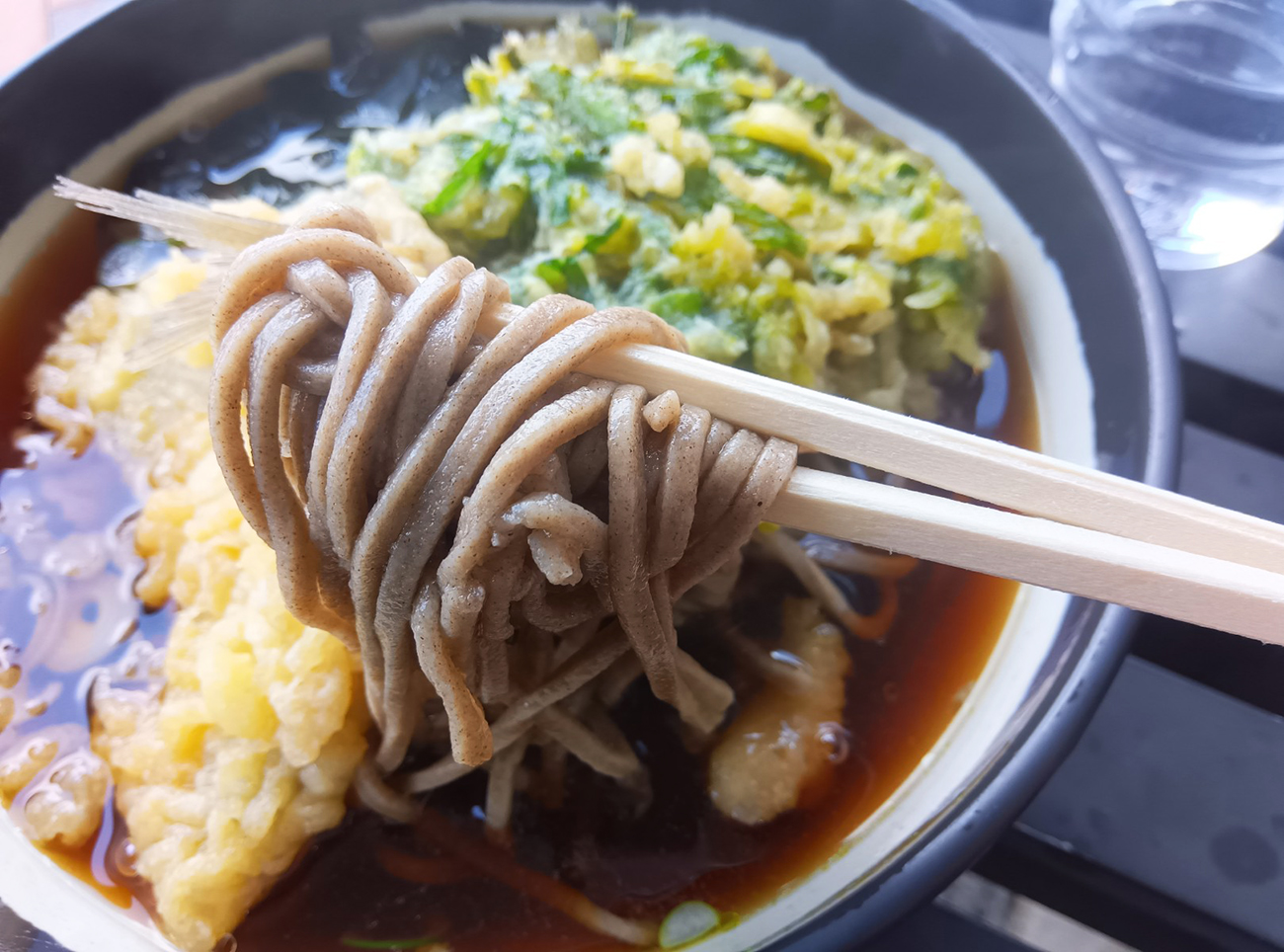 私(中澤)が注文したのは「アジ天そば春菊天トッピング(税込650円)」だ。かけそばが税込350円でトッピングのが揚げ物が一律150円という分かりやすいシステム。この物価高のご時世にかけそば350円、天ぷら2つ乗って650円は安い。