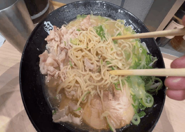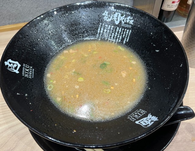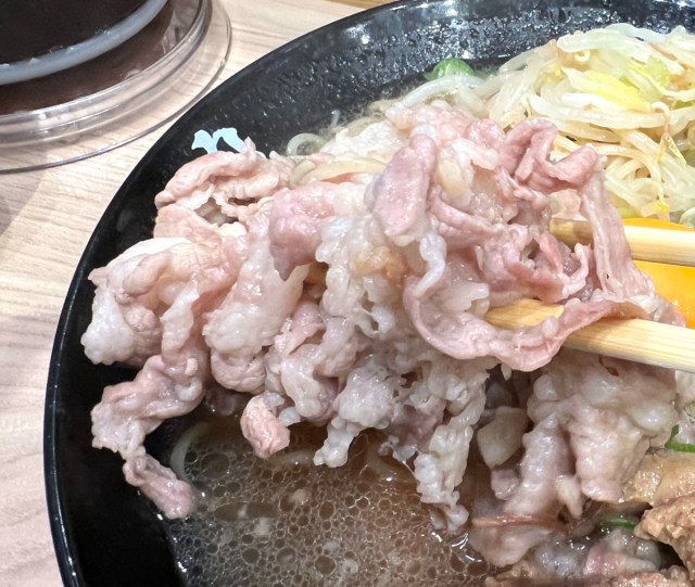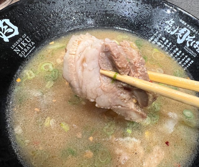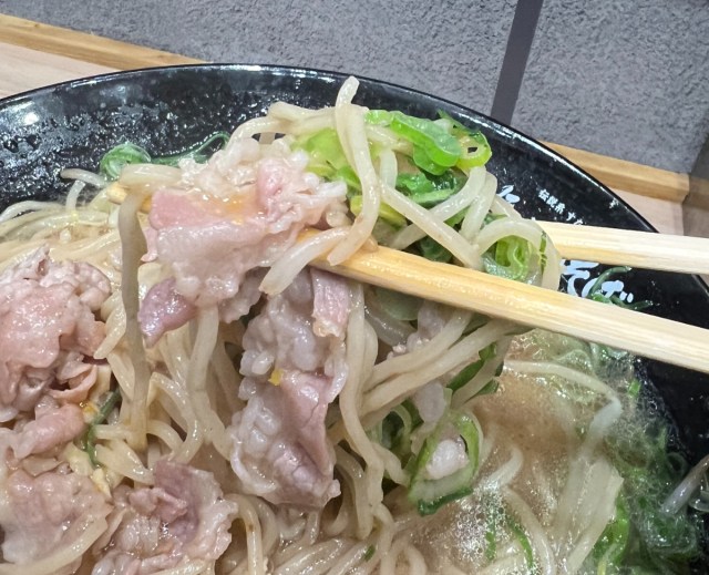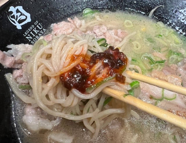 秘伝のニンニク醤油ダレがしっかり染みた豚バラ肉は、「伝説のすた丼屋」のすた丼で使われているものだろう。白米と一緒に掻き込む味が、今回は麺と合わせて楽しむことになる。この時点で期待値がグンと上がる。