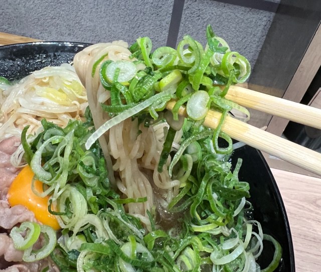 箸で麺を持ち上げるとネギも一緒にわしゃわしゃとくっついてくる。麺は全粒粉を使用した特注麺で、コシがしっかりしている。すた丼の柔らかい白米とは対照的に、麺は噛めば噛むほど味わい深い。