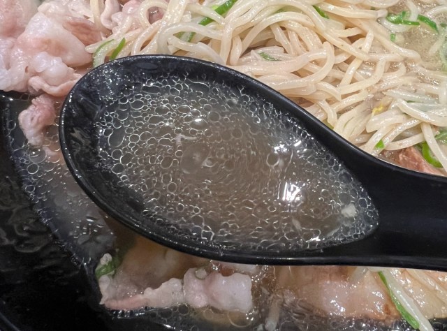 スープをレンゲですくってみると、表面に脂の膜が張っている。