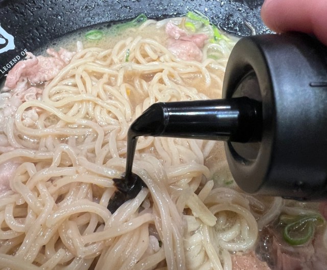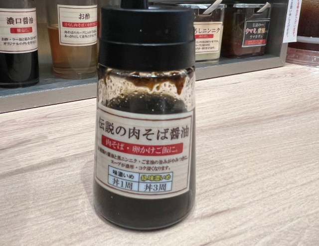 そしていよいよ、卓上調味料の出番。まずは「伝説の肉そば醤油」を投入してみる。