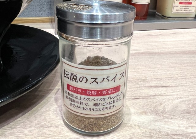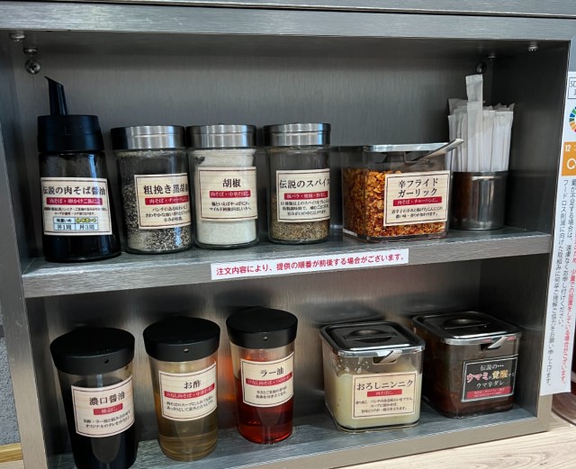 卓上を見て驚いた。調味料の種類がハンパない。「伝説の肉そば醤油」「粗挽き黒胡椒」「胡椒」「伝説のスパイス」「辛フライドガーリック」が上段に。